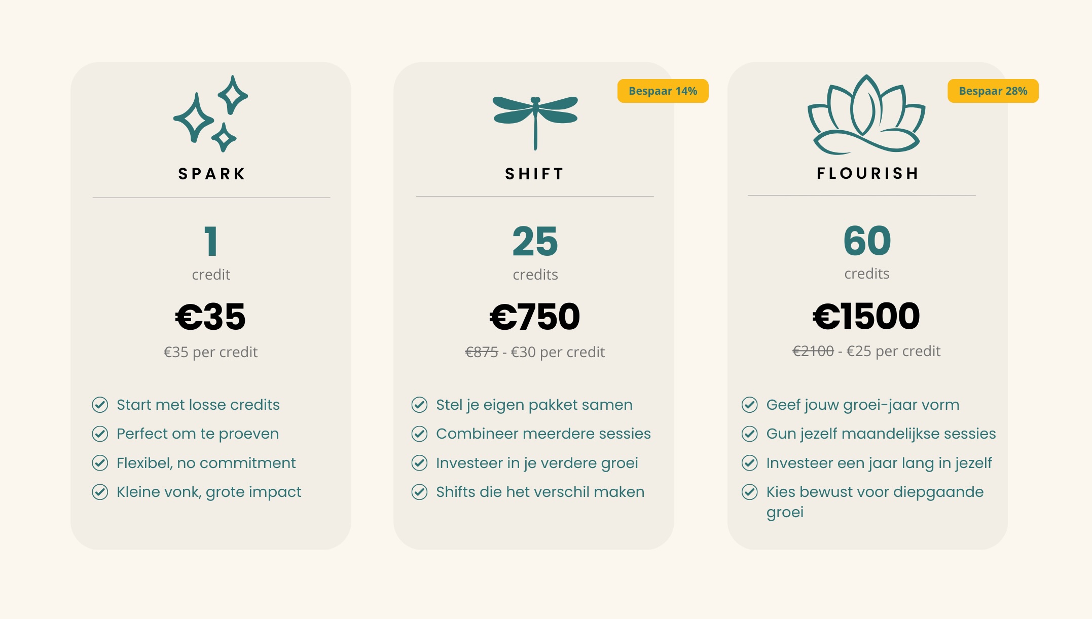 Voor een intervisie, supervisie en expert sessie van 3u betaal je 5 credits. Voor een Shift&Connect dag op locatie met catering betaal je 10 credits. Voor een individuele coachsessie van 1 uur betaal je 7 credits.